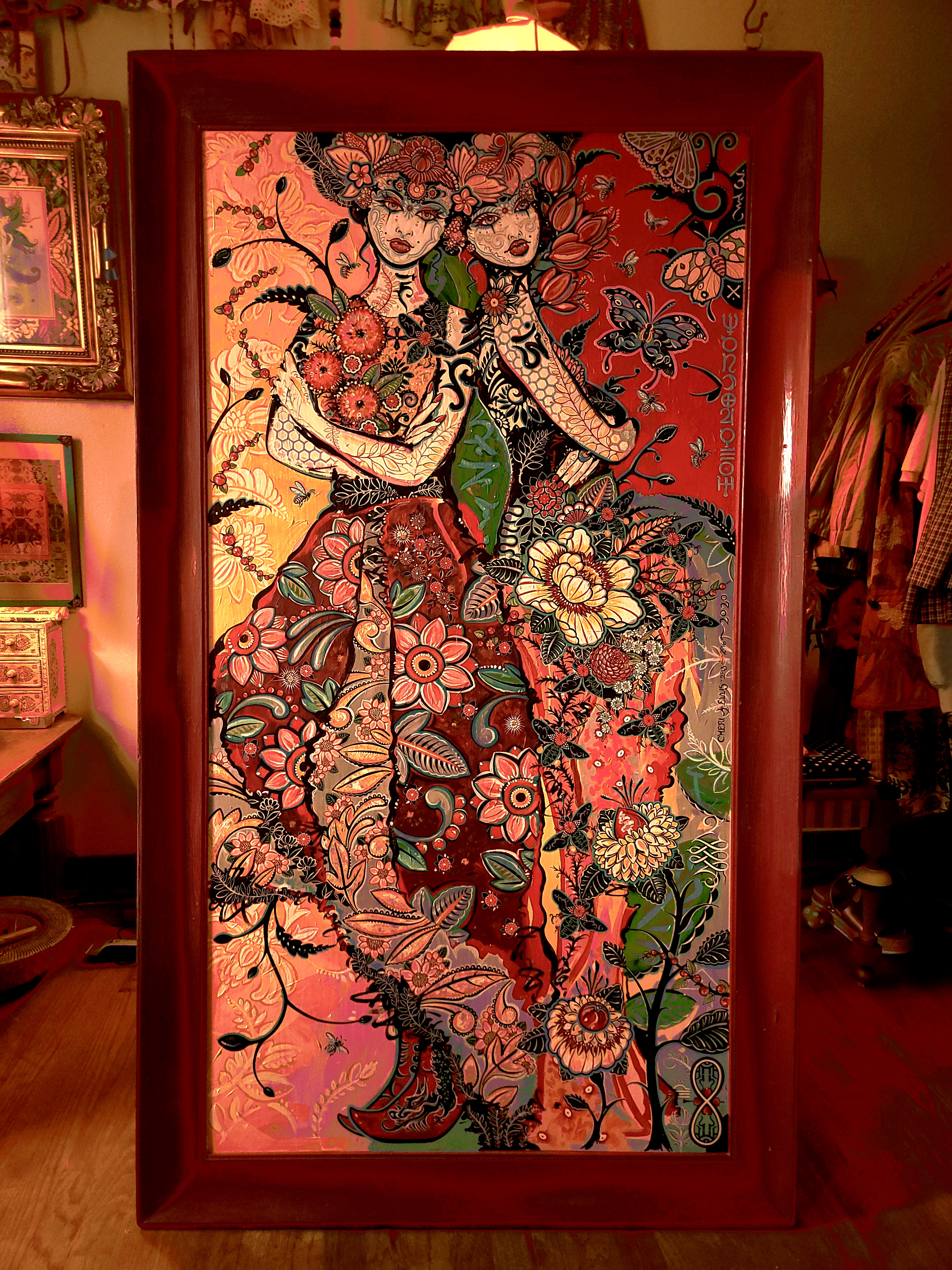 SUFI FLOWER SISTERS painting (below) is a 13 year journey into the concept of individuation, completing in the last weeks of 2025 through the first weeks of 2026. The painting, never meant to be seen, or shown, or sold, began its evolution in 2013 where it seeded the effort to create and give voice through a process of transformative alchemization. This process allowed for the embodiment of the philosophies that inspired the imagery, to be internalized through the days, weeks and years it developed. The painting is a 'style development" piece that began to express, to take on, the essence of the style that self alignment creates.
