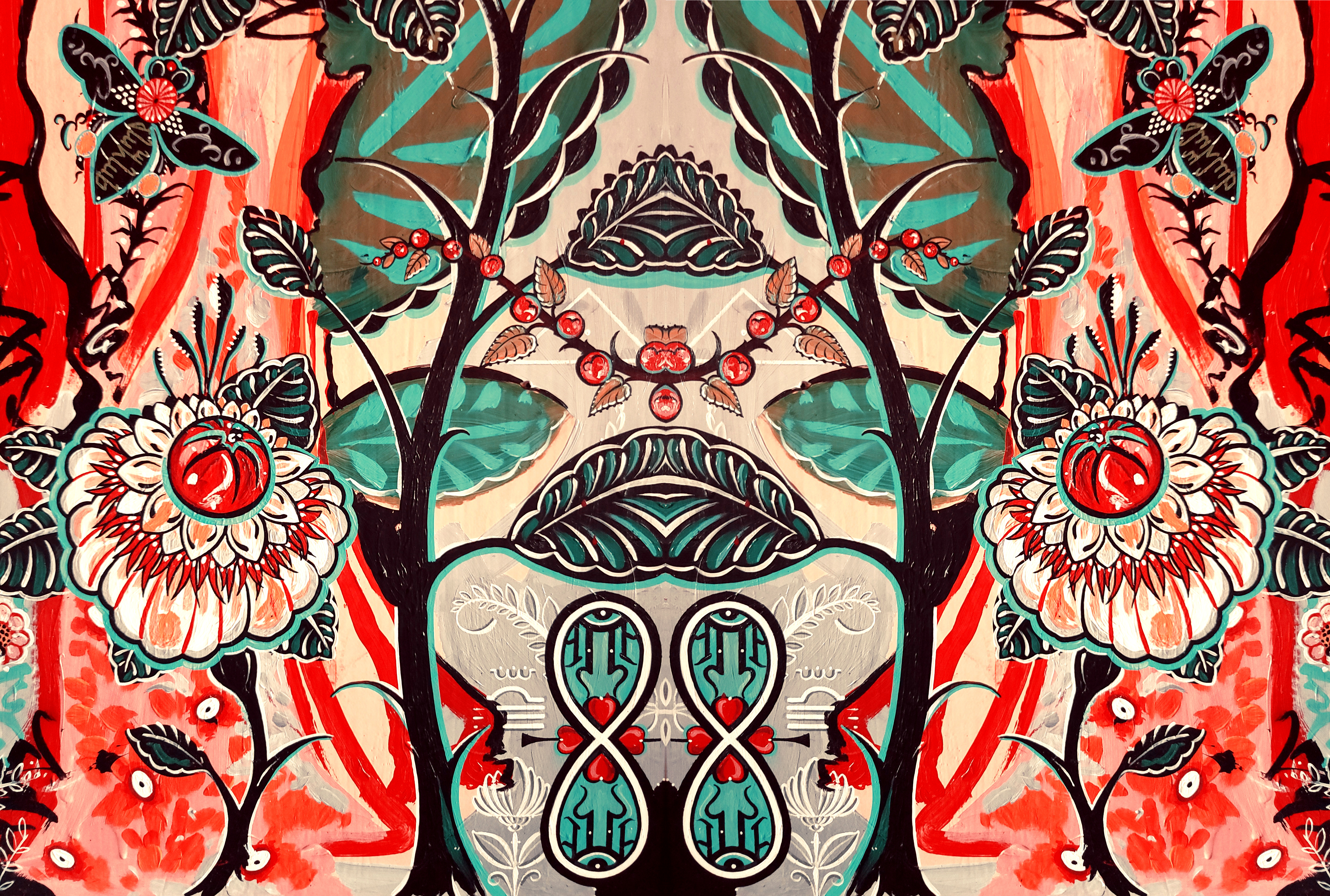 NEGREDO / "the blackening (or nigredo) is the first, often painful stage of this process, representing a 'psychosymbolic' death where the ego breaks down and the shadow self is confronted" This might be why I have often incorporated the strong aspect of black outlining, being a creature of constant transmutation through life experiences. At some point, I repainted the larger bee designs, making them all black, and writing on them a secret message, in green paint, with the runic alphabet. The "Life / Death / Rebirth" cycles of nature that the bee so powerfully represents, and our inherent survival need to abide by these laws. The painting finished with the core of the sister on the right being painted black and then graced with the white outline of an emerging seedling.