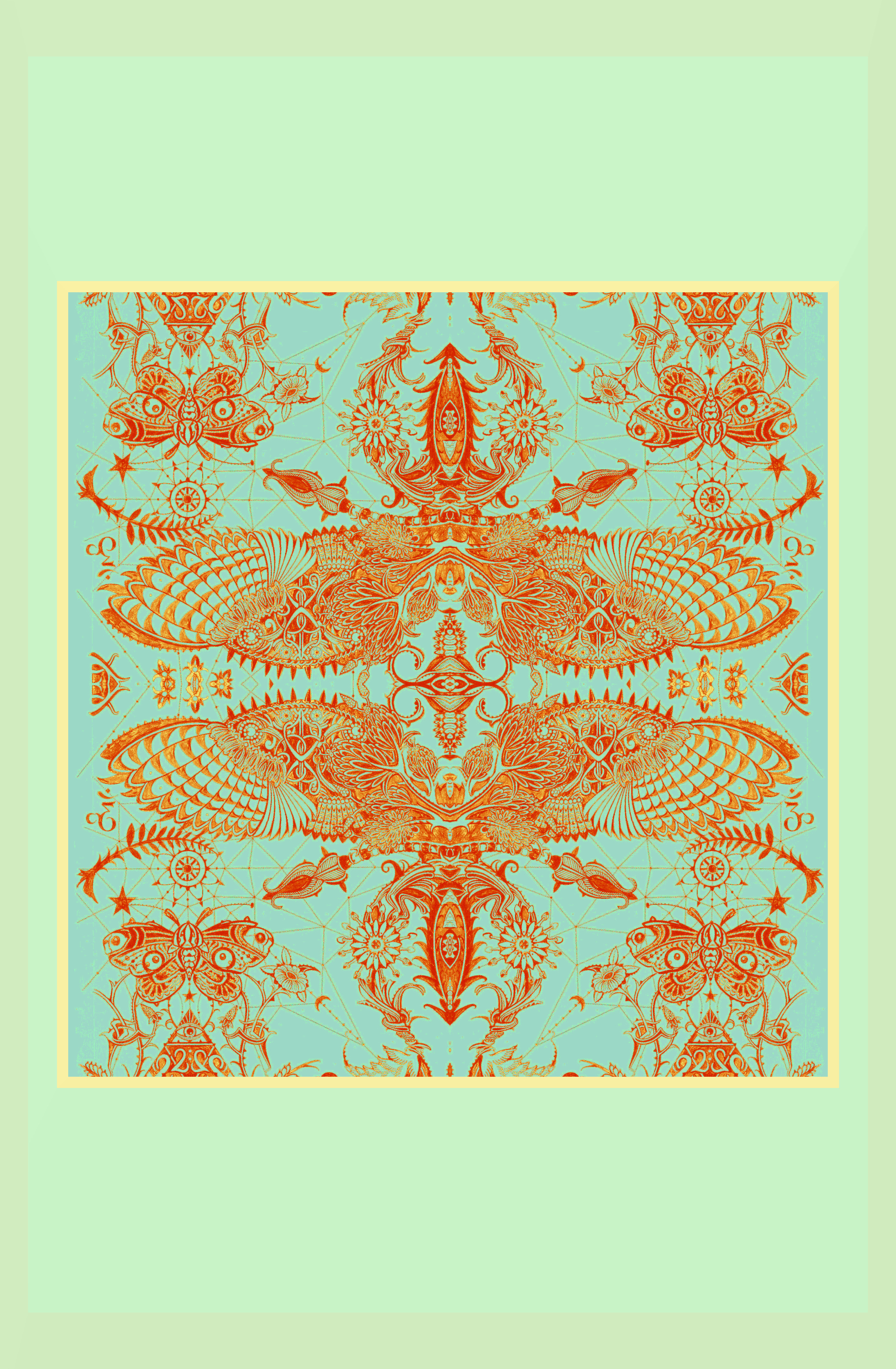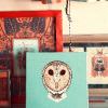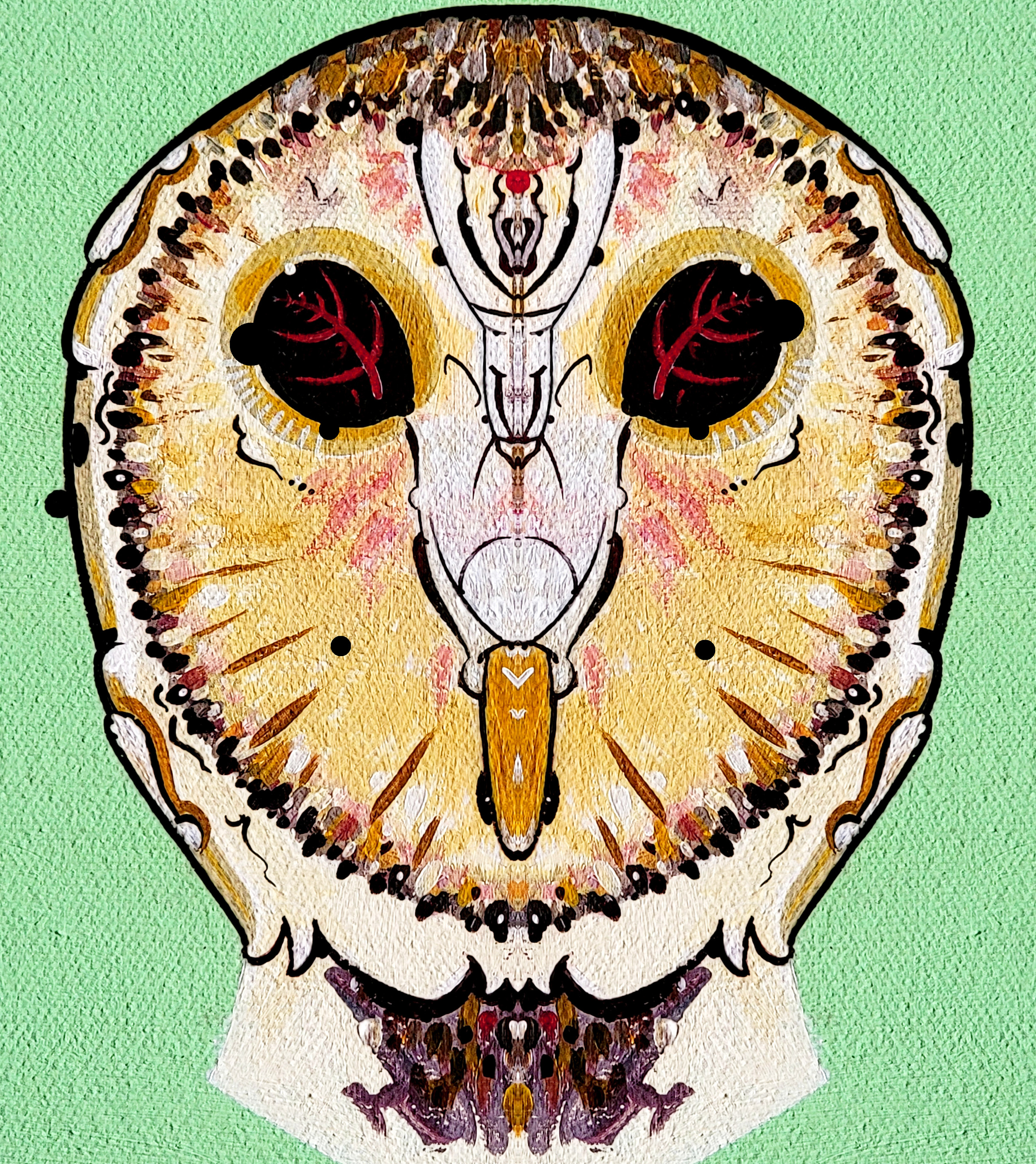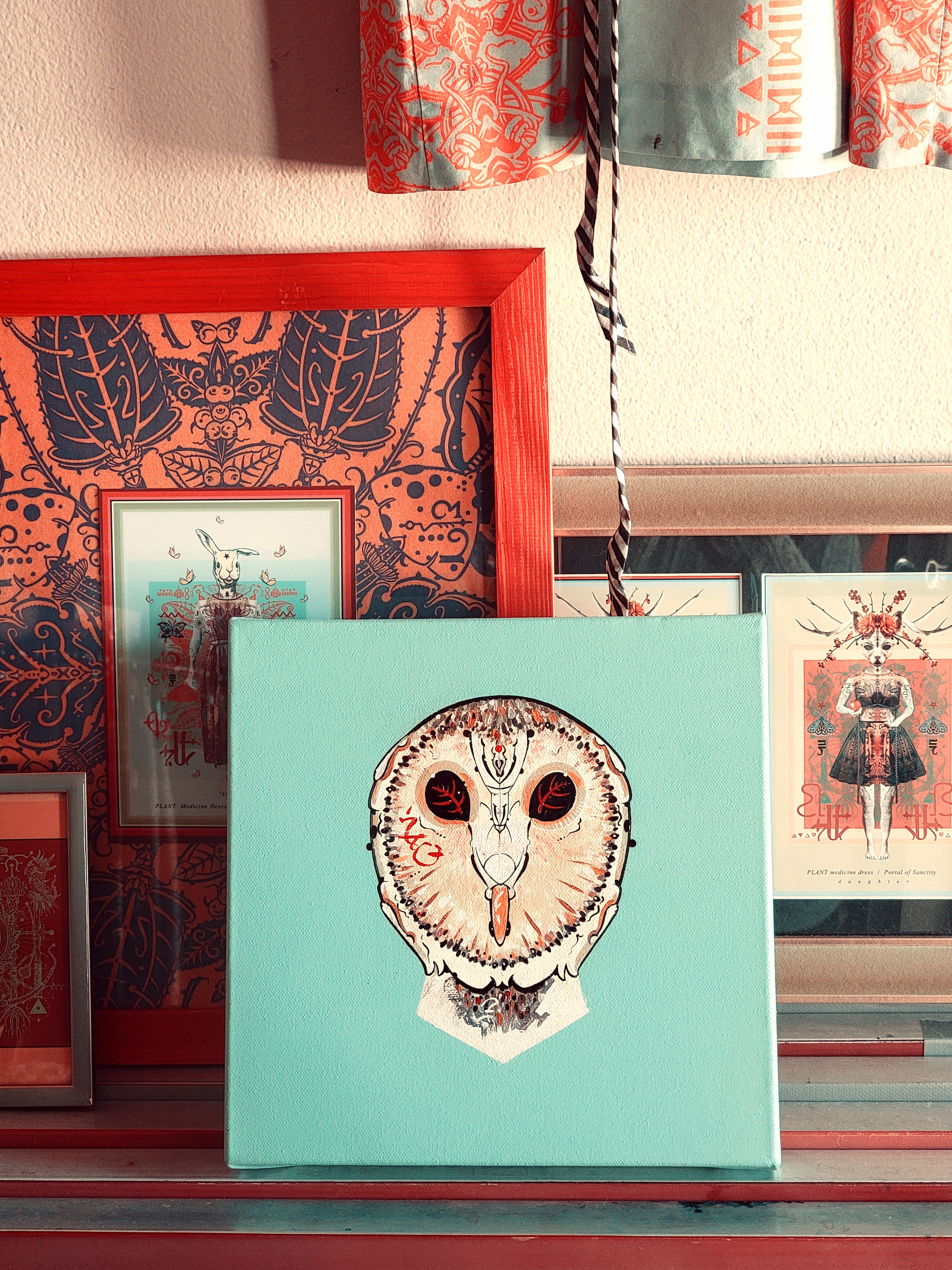 SUFI OWL / EMBODIMENT is a digital collage (below) merging the flowers from the painting, with a painted owl head, and a handmade dress created from fabric printed with the "Plant Medicine" artwork. The back-round imagery is created from a pen and ink illustration called "Owl Bee" (click onto the small images at the left). These continuing fantasy depictions make the little ethereal animal elementals the truest of models for the garments that embody the wisdoms of nature. This particular imagery is being developed for an oracle card series.