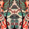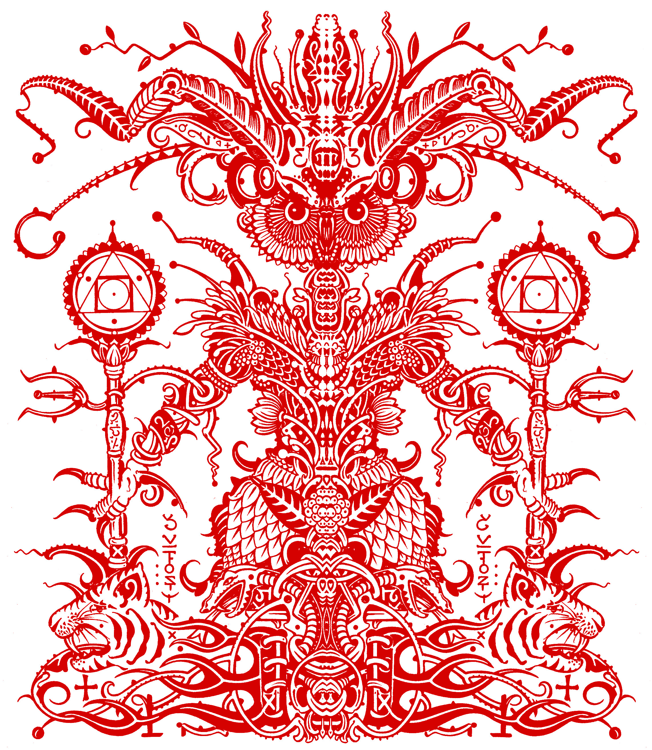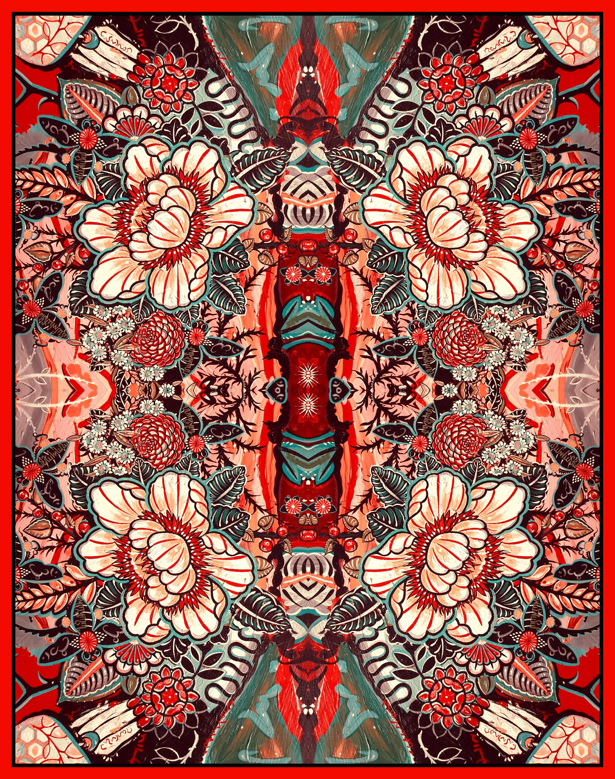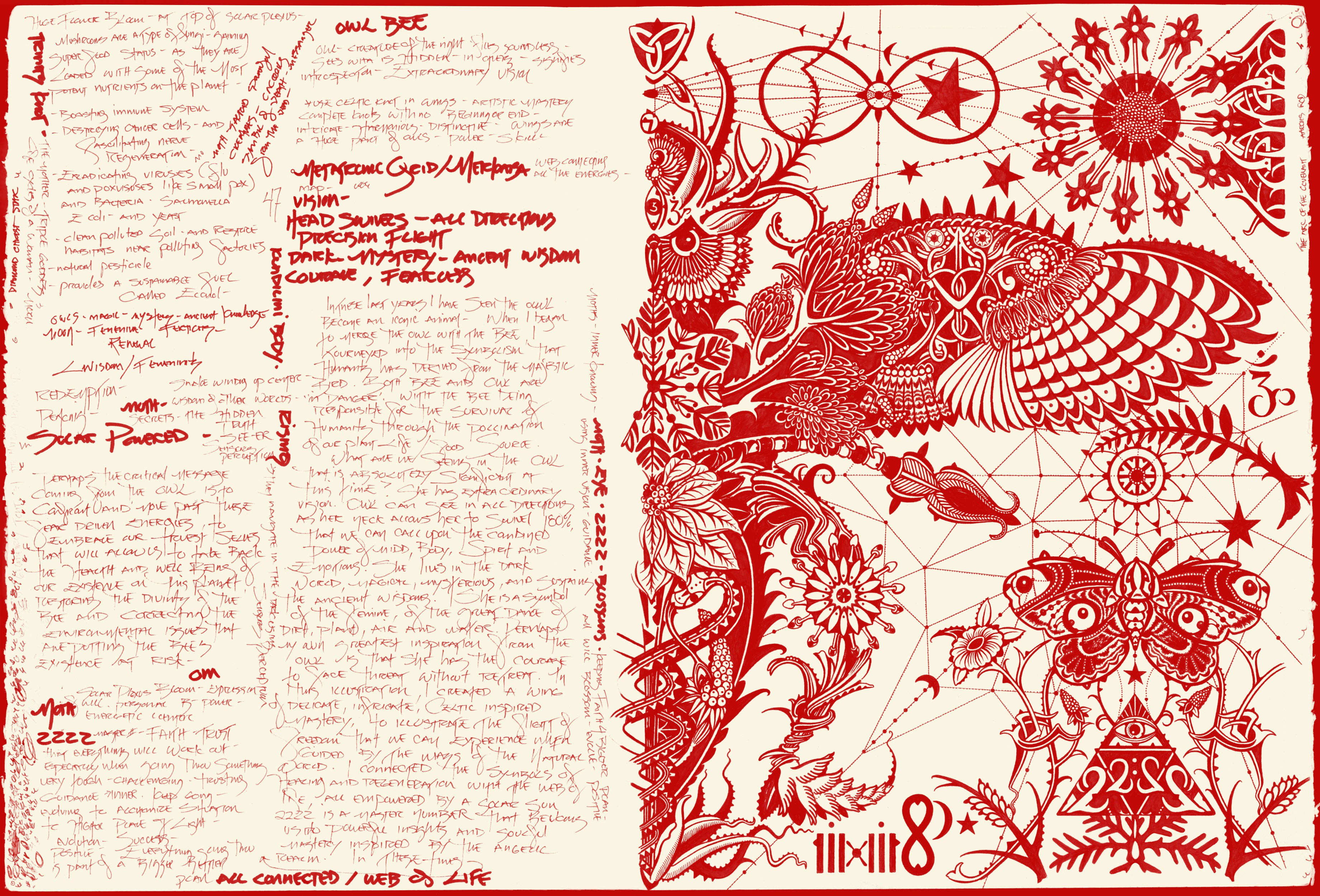 RUBEDO / (Redness) "the final stage of the individuation process, symbolizing perfection (authenticity and self alignment versus an external expectation) synthesis, and the total fusion of opposing principles. It represents the completion of the Philosopher's Stone / alchemy, turning lead into gold." The painting is filled with red mandala-like, painted spheres with multiple unfolding petals. A red backround for the transmuting moths and butterflies.